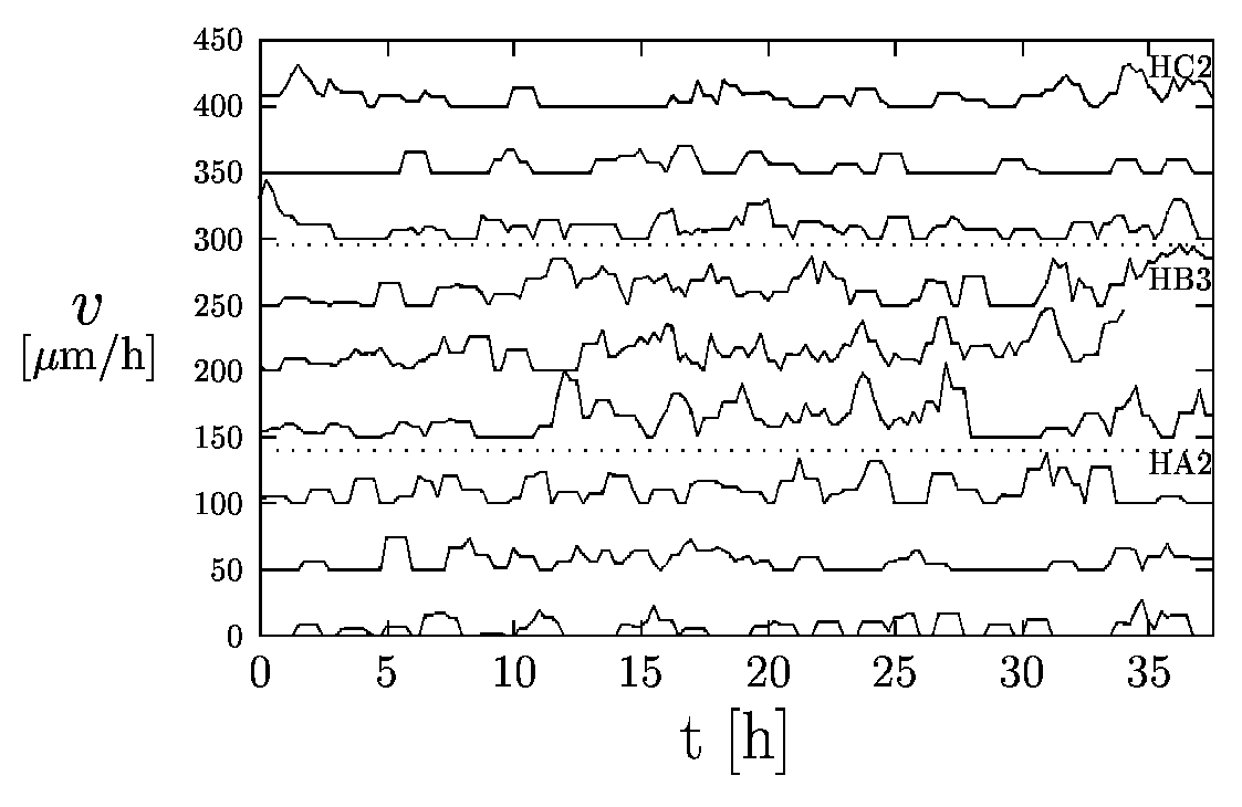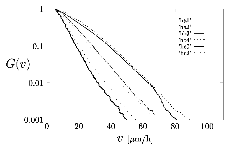 6.ábra Három azonos diagnózisú tumorból származó sejtvonalak 2-2 tenyészetének sebességeloszlása: G(v) megadja annak a valószínűségét, hogy egy véletlenszerűen kiválasztott sejt sebessége nagyobb lesz, mint v. Mint megfigyelhető, a sebességeloszlás reprodukálható és szignifikáns különbséget mutatott ki a három sejtvonal között.