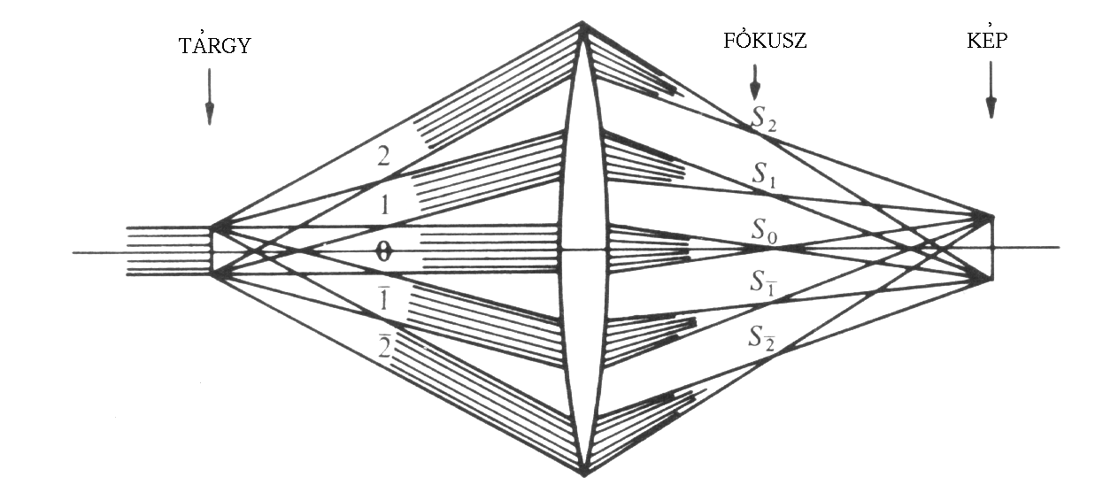 A mikroszkóp pontszerű fényforrásának a kondenzor által párhuzamosított fénynyalábja érkezik a tárgyra. A tárgyon a nyaláb egy része elhajlás nélkül halad át, míg a másik részét a tárgy inhomogenitásai elhajlítják. Mind az elhajlított, mind az el nem hajlított fényhullámok az objektívbe, a tárgylencsébe jutnak. Az objektív az el nem hajlított fényhullámokból a képoldali gyújtópontjában létrehozza a pontszerű fényforrás képét, míg az elhajlított fényhullámok a képoldali gyújtósík más pontjaiban gyűlnek össze. Mindezen képek, mint másodlagos fényforrások, egymással interferálva a tubus felső részében létrehozzák a szemlencsében látható képet.